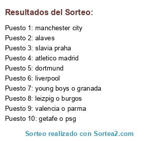 Lista de participantes: chelsea, granada, city, parma / getafe o psg, liverpool, atletico de madrid.