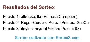 Lista de participantes: alberbadilla (Primera Campeón), Roger Cordero Perez (Primera SubCampeón), deybisarayar (Primera Puesto 03).