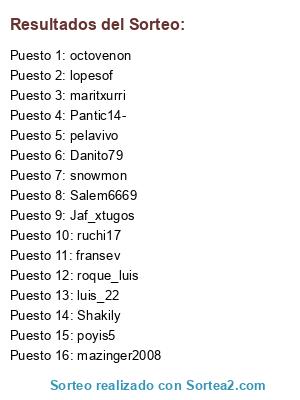 Lista de participantes: Shakily , poyis5, Jaf_xtugos, ruchi17, fransev, mazinger2008, Danito79, snowmon, Salem6669, pelavivo, maritxurri, lopesof, octovenon, Pantic14-, luis_22, roque_luis.