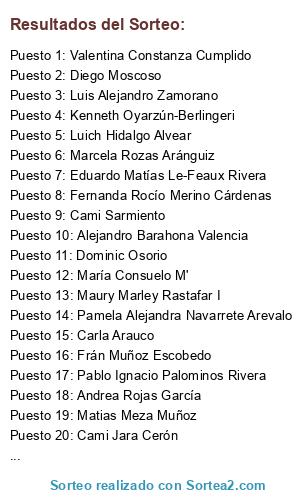 Lista de participantes: Aileen Dennise Reyes Salinas, Alejandro Andres Daza Aravena (Darkdeper), Alejandro Barahona Valencia, Aljandro Urzua, Alex Mariano Lopez Cubillos (Malibuu Stiffi), Alexandra Escobar (De Mi Hernan), Alison Andrea Quijana, Andrea Rojas García, Ariadna Camila Castro Torres (Agustín), Barbara C'taLina V F (باربرا ولوقا), Bàrbara Garate J, Barco Basurero, Bastian Canales Avila, Beatriz Alejandra Lobos (Te Amo Pepé), Belen Isidora Hermoso, Caamy Feer Gp', Cami Sarmiento, Camila Andrea Moyano Celedon, Camila Fernanda Díaz Duque, Camila Fernanda Maldonado Tapia, Camila Peña Marmolejo, Carla Arauco, Carla Javiera Valderrama Espinoza, Cata Fernández, Catalĭna Andrea Campos Soto, Catalina Cárcamo, Catherine Arlenne Miranda Ruz, Claudia Andrea Díaz Vargas, Claudio S. Arévalo Salinas, ClaƱdio AhƱmada, Constanza Javiera Diaz Leon, Constanzaa Andreeaa, Cristian Aravena, Damarie Nayadeth Moyano Madrid, Danny Francisca, David Bladimir, David Briones Paredes, Diego Ignacio Ponce Lizana, Diego Moscoso, Diego Rojas Cardenas, Dominic Osorio, Dorian Alejandro Abarca Muñoz, Eduardo Matías Le-Feaux Rivera, Eduu Fuentes Pino, Elizabeth Noemi Dinamarca, Eloisa D. López, Eric Alexander Villagra, Esteban Pavez Trujillo, Felipe Diaz Slater, Felipe Gaune Ogaz, Felipe Ignacio Cereño Jorquera, Fernanda Paola Palma Gómez, Fernanda Rocío Merino Cárdenas, Frán Muñoz Escobedo, Francisca Javiera Silva Bueno, Francisco Lopez Canales, Gabriel Esteban, Gabriela R. Espinoza Diaz, Gianii A' Montecino, Gonzalo Esteban Briones Galvez, Helen Cardenas, Hugo Ignacio Ponce Reyes, Ignacio Alberto Muñoz Agurto, Ignacio Enrique Lopez Ortiz, J Josee S'v, Jacenka Arely Aburto Saez, Jael Antonia Ramos Gonzalez, Javiera Constela, Javiera Gomez, Javiera Paz Alegria Rodriguez, Jesus Antonio, Johan Salgado Salgado, Jonathan Daniel Cisternas Diaz, Jorge Ignacio Zamorano Alfaro, José Antonio Villagra Muñoz, JP Silva, Karen' Espinoza Gomez, Karina Gonzalez Dominguez, Karina Zúñiga, Katherine A-v, Katherine Cifuentes Vasquez, Katherine Labbé, Katherine Mardones Muga, Kenneth Oyarzún-Berlingeri, Lalito Paredes Parraguez, Leonardo Francisco Ac, Lizette Fernandez Palma, Lorena Rosas T, Luich Hidalgo Alvear, Luis Alejandro Zamorano, Marcela B. Michea, Marcela Rozas Aránguiz, Marco Alvarado, Marcos Espinoza, María Consuelo M', Maria Jose Ibarra Pozo, Maria Jose Muñoz Pereira, Matias Meza Muñoz (6 participaciones), Matías Morales Vídela, Maury Marley Rastafar I, Megan Beck Ayala, Michelle Gonzalez Concha, Michelle Gubernatti, Natalia Manriquez Martinez, Nef Fotografia, Nicky Escobar, Nicole Oyarce Valenzuela, Oscar Pizarro Hormazabal, Pablo Antonio Vergara Velásquez, Pablo Ignacio Palominos Rivera, Pamela Alejandra Navarrete Arevalo, Patricio Esteban Pasten Guajardo, Pipe Nicolas Michea Ibañez, Pokelo Morales, Rafael Ignacio Abarca Lillo, Roberto Nuñez Pardo, Rodrigo Alejandro Araya Muñoz, Cami Jara Cerón, Román Briceño Marquéz, Rorro Soto Kalderón, Roxana Andrea Castro Cartes, Sebastián González, Tamara Arauco, Valentina Caceres Sepulveda, Valentina Constanza Cumplido, Valentina Rojas, Valeria Carvajal Rojas, 貞子 モンスター.