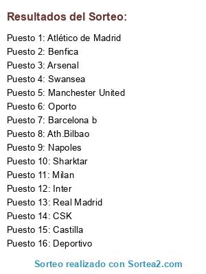 Lista de participantes: Arsenal, AS Monaco, Atlético de Madrid, Ath.Bilbao, Barcelona, Barcelona b, Bayern Munchen, Benfica, Bolton, B.Dortmund, Chelsea, CSK, Deportivo, Elche, Fiorentina, Galatasaray, Hércules, Inter, Juventus, Kaiserlautern, Lazio, Liverpool, Mallorca, Manchester City, Manchester United, Milan, Napoles, Newcastle, Lyon, Oporto, Palermo, PSG, QPR, Reading, Jaen, Real Madrid, Castilla, Zaragoza, Sharktar, Schalke, Sevilla, Swansea, Tottenham, Tenerife, Watford, Wigan, Wolfsburgo, Zenit.
