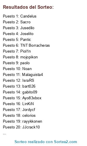 Lista de participantes: paolo, TNT Borracheras, Pantic, mojopikon, Sacro, bart026, Piol1n, celorios, JJcrack10, Ayo83xbox, rayykkonen, Jusedilo, carrique, LinKiN, gabito09, Jordycf, xtian33, erpollo, Jaimito, Joselito, Candelus, Malaguista4, IsraRS, Noan, Droigner.