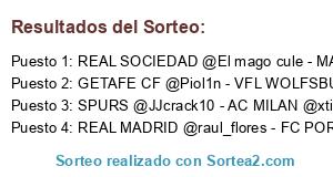 Lista de participantes: REAL SOCIEDAD @El mago cule - MANCHESTER CITY, GETAFE CF @Piol1n - VFL WOLFSBURG @IntiPodesta, REAL MADRID @raul_flores - FC PORTO @Droigner, SPURS @JJcrack10 - AC MILAN @xtian33 .