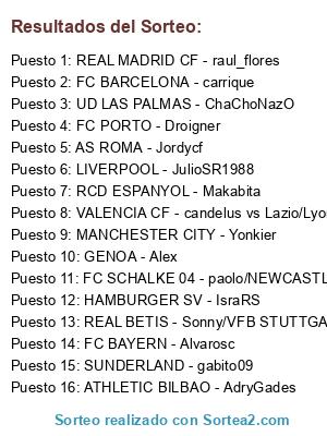 Lista de participantes: AS ROMA - Jordycf, FC BARCELONA - carrique, FC BAYERN - Alvarosc, REAL MADRID CF - raul_flores, LIVERPOOL - JulioSR1988, MANCHESTER CITY - Yonkier, UD LAS PALMAS - ChaChoNazO, SUNDERLAND - gabito09, HAMBURGER SV - IsraRS, GENOA - Alex, RCD ESPANYOL - Makabita, FC PORTO - Droigner, REAL BETIS - Sonny/VFB STUTTGART - Danitelli, VALENCIA CF - candelus vs Lazio/Lyon, FC SCHALKE 04 - paolo/NEWCASTLE UTD - RaKaLDaS, ATHLETIC BILBAO - AdryGades.