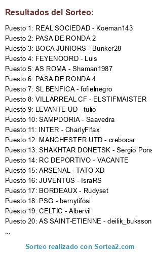 Lista de participantes: AS MONACO - santos, AS ROMA - Shaman1987, BOR. DORTMUND - santos, BORUSSIA MG - Piol1n, FC BARCELONA - carrique, FC BAYERN - Alvarosc, FC PORTO - Droigner, FIORENTINA - TNT Borracheras, JUVENTUS - IsraRS, LIVERPOOL - JulioSR1988, MANCHESTER CITY - Yonkier, OLYMPIAKOS - Alelele, REAL MADRID CF - JUANCA71, SEVILLA FC - mojopikon, SL BENFICA - fofielnegro, SPURS - Jota I11I, UD LAS PALMAS - ChaChoNazO, VFL WOLFSBURG - IntiPodesta, VILLARREAL CF - ELSTIFMAISTER, WEST HAM UNITED - Vengard, AC MILAN - Sonny, AJAX - Sukurpim, ARSENAL - TATO XD, ATHLETIC BILBAO - Escudero 46, ATLETICO MADRID - celorios, BAYER 04 - YouyeTara, BOCA JUNIORS - Bunker28, BORDEAUX - Rudyset, EVERTON - Trunksykiara, LEICESTER CITY - jayser, MALAGA CF - David, MANCHESTER UTD - crebocar, OLYMPIQUE LYON - Suresteverdadero, PANATHINAIKOS - Noan, RCD ESPANYOL - Makabita, SAMPDORIA - Saavedra, SHAKHTAR DONETSK - Sergio Pons, SPORTING CP - Morea, VALENCIA CF - Candelus, VFB STUTTGART - Danitelli, ANDERLECHT - rayco, AS SAINT-ETIENNE - deilik_buksson, CELTA - VACANTE, CELTIC - Albervil, CHELSEA - KloN, FEYENOORD - Luis, INTER - CharlyFifax, LAZIO - caymandg, LEVANTE UD - tulio, MARSEILLE - bart026, NAPOLI - Maik, NEWCASTLE UTD - jcapcadiz, PSG - bernytifosi, PSV - zeben, RC DEPORTIVO - VACANTE, REAL BETIS - Javi95madrid, REAL SOCIEDAD - Koeman143, RIVER PLATE - Clannish, SUNDERLAND - Montxi, WERDER BREMEN - hectorpiko, PASA DE RONDA 1, PASA DE RONDA 2, PASA DE RONDA 3, PASA DE RONDA 4.