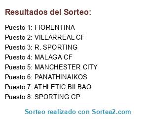 Lista de participantes: VILLARREAL CF, MALAGA CF, R. SPORTING, SPORTING CP, ATHLETIC BILBAO, FIORENTINA, PANATHINAIKOS, MANCHESTER CITY.