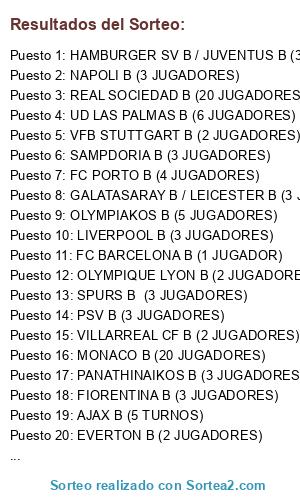 Lista de participantes: FC BARCELONA B (1 JUGADOR), GALATASARAY B / LEICESTER B (3 JUGADORES), SPURS B (3 JUGADORES), FC PORTO B (4 JUGADORES), LIVERPOOL B (3 JUGADORES), BORDEAUX B (20 JUGADORES), AJAX B (5 TURNOS), OLYMPIQUE LYON B (2 JUGADORES), UD LAS PALMAS B (6 JUGADORES), FC BAYERN B (2 JUGADORES), REAL SOCIEDAD B (20 JUGADORES), MONACO B (20 JUGADORES), FEYENOORD B (20 JUGADORES), FIORENTINA B (3 JUGADORES), SAMPDORIA B (3 JUGADORES), VALENCIA B (6 JUGADORES), RCD ESPANYOL B (4 JUGADORES), MALAGA CF B (3 JUGADORES), PANATHINAIKOS B (3 JUGADORES), HAMBURGER SV B / JUVENTUS B (3 JUGADORES), MANCHESTER CITY B (2 JUGADORES), BOCA JUNIORS B (2 JUGADORES), AS ROMA B (5 JUGADORES), SEVILLA FC B (4 JUGADORES), INTER B (20 JUGADORES), REAL MADRID CF B (3 JUGADORES), GETAFE CF B (2 JUGADORES), VFB STUTTGART B (2 JUGADORES), UDINESE B (3 JUGADORES), EVERTON B (2 JUGADORES), OLYMPIAKOS B (5 JUGADORES), VILLARREAL CF B (2 JUGADORES), NAPOLI B (3 JUGADORES), PSG B (1 JUGADOR), ATLETICO MADRID B (1 JUGADOR), NEWCASTLE UTD B (6 JUGADORES), VFL WOLFSBURG B (5 JUGADORES), PSV B (3 JUGADORES).