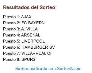 Lista de participantes: VILLARREAL CF, AJAX, HAMBURGER SV, SPURS, LIVERPOOL, ARSENAL, A. VILLA, FC BAYERN.