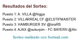 Lista de participantes: AJAX @sukurpim - FC BAYERN @Alvarosc (Esta semana para jugarlo), A. VILLA @Nigga, HAMBURGER SV @IsraRS, VILLARREAL CF @ELSTIFMAISTER - SPURS @JJcrack10 (Esta semana para jugarlo).