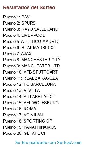 Lista de participantes: AJAX, A. VILLA, AC MILAN, ATLETICO MADRID, FC BARCELONA, GETAFE CF, LIVERPOOL, MANCHESTER CITY, MANCHESTER UTD, PANATHINAIKOS, PSV, RAYO VALLECANO, REAL MADRID CF, REAL ZARAGOZA, ROMA, SPORTING CP, SPURS, VFB STUTTGART, VFL WOLFSBURG, VILLARREAL CF.