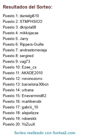 Lista de participantes: Jarry, urbana, sergired, alejodizze, barcelona30bcn, gabriii_10, dknjota08, Rippers-Guille, martikenobi, andrestorrevieja, Enevermind82, danielgi610, STMPHSICO, AKADE2010, rononozorro, mikkojacas, YoZuuX, roberskk, vag73, Ezee_cs.