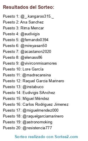 Lista de participantes: Ana Sanchez, Carlos Rodriguez Jimenez, Catalina Najar Rodriguez, Centro Comercial Alcalá Norte, Eudivigis SAnchez, Lore García, Miguel Méndez, Raquel Garcia Marinero, Rima Mencar, @elenass86, @vivirconmisamores, @acastanon2020, @eudivigis, @astronomoking, @madrecansina, @resistencia777, @miguelmendez000, @raquelgarciamarinero, @_.kangaroo315._, @instabuco, @mireyasan50, @fernando0394.