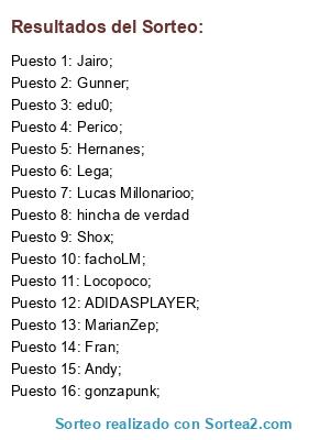 Lista de participantes: Andy;, Lega;, gonzapunk;, hincha de verdad, Shox;, Fran;, ADIDASPLAYER;, Lucas Millonarioo;, edu0;, Hernanes;, Gunner;, fachoLM;, MarianZep;, Perico;, Locopoco;, Jairo;.