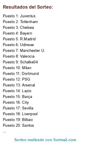 Lista de participantes: Napoles, Lazio, Juventus, Barça, Dortmund, Bilbao, City, Schalke04, At. Madrid, Milan, Udinese, PSG, Valencia, Sevilla, Bayern, Chelsea, Arsenal, R.Madrid, Tottenham, Zenit, Inter, Manchester U., Santos, Liverpool.