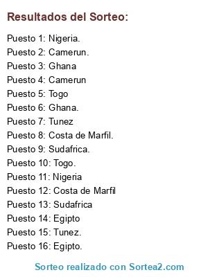 Lista de participantes: Egipto, Camerun, Costa de Marfil, Ghana, Nigeria, Sudafrica, Togo, Tunez, Egipto., Camerun., Costa de Marfil., Ghana., Nigeria., Sudafrica., Togo., Tunez..