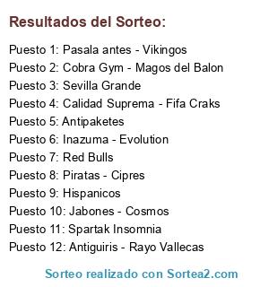 Lista de participantes: Antipaketes, Spartak Insomnia, Jabones - Cosmos, Cobra Gym - Magos del Balon, Antiguiris - Rayo Vallecas, Hispanicos, Inazuma - Evolution, Calidad Suprema - Fifa Craks, Piratas - Cipres, Sevilla Grande, Red Bulls, Pasala antes - Vikingos.