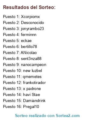 Lista de participantes: ANicolao, bertillo78, Damiandrink, eckae, ferminnn, frankotirador, havi Stae, jonyrambo23, nanocampeon, new luzbel, Pregal10, qmemetes, sent3nza88, x padrone, Xcorpiomx, Desconocido.