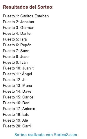 Lista de participantes: Ale, Ángel, Antonio, Carlitos Esteban, Carlos, Carrijl, Dani, Dante, Dave, Edu, German, Isra, Iván, JL, Jonatan, Jose, Juanliti, Manu, Pepón, Saen.