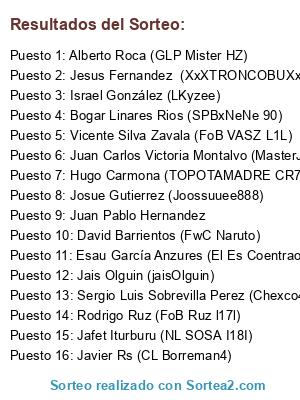 Lista de participantes: Vicente Silva Zavala (FoB VASZ L1L), Bogar Linares Rios (SPBxNeNe 90), Javier Rs (CL Borreman4), Jafet Iturburu (NL SOSA I18I), Esau García Anzures (El Es Coentrao), David Barrientos (FwC Naruto), Rodrigo Ruz (FoB Ruz l17l), Hugo Carmona (TOPOTAMADRE CR7), Sergio Luis Sobrevilla Perez (Chexco4), Jais Olguin (jaisOlguin), Israel González (LKyzee), Juan Pablo Hernandez, Jesus Fernandez (XxXTRONCOBUXxX), Josue Gutierrez (Joossuuee888), Juan Carlos Victoria Montalvo (MasterJeyce), Alberto Roca (GLP Mister HZ).
