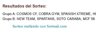 Lista de participantes: COSMOS CF, SPARTANS, COBRA GYM, SOTO DE CARABA, MCF´08, SPANISH XTREME, NEW TEAM, HISPANICOS.