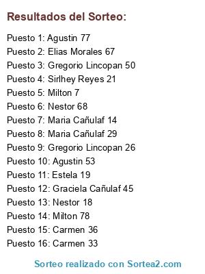 Lista de participantes: Sirlhey Reyes 21 , Elias Morales 67 , Milton 7 , Milton 78 , Estela 19 , Graciela Cañulaf 45 , Carmen 33 , Carmen 36 , Agustin 53 , Agustin 77 , Maria Cañulaf 14 , Maria Cañulaf 29 , Gregorio Lincopan 50 , Gregorio Lincopan 26 , Nestor 68 , Nestor 18.