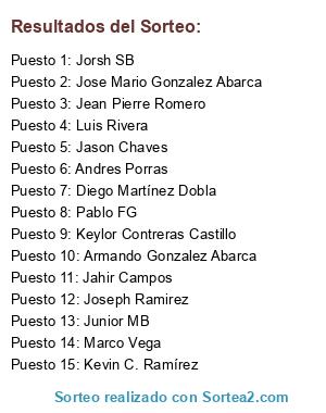 Lista de participantes: Diego Martínez Dobla, Junior MB, Jose Mario Gonzalez Abarca, Joseph Ramirez, Jean Pierre Romero, Jason Chaves, Marco Vega, Andres Porras, Jorsh SB, Armando Gonzalez Abarca, Jahir Campos, Luis Rivera, Kevin C. Ramírez, Pablo FG, Keylor Contreras Castillo.