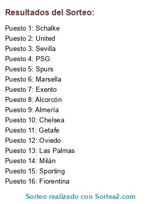 Lista de participantes: Oviedo, Sporting, PSG, Fiorentina, Spurs, Alcorcón, Almería, United, Las Palmas, Schalke, Sevilla, Chelsea, Milán, Marsella, Getafe, Exento.