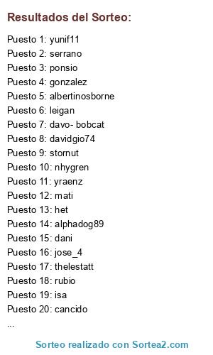 Lista de participantes: mazokie, ponsio, rojinu, isa, mati, stornut, nhygren, dario, het, juanjito, gonzalez, titohan, dani, jose_4, spawn, thelestatt, yraenz, rubio, juanma-2011, serrano, kalevra32, cancido, leigan, alphadog89, davidgio74, carlos_urena, albertinosborne, yunif11, x0abel0x, davo- bobcat.