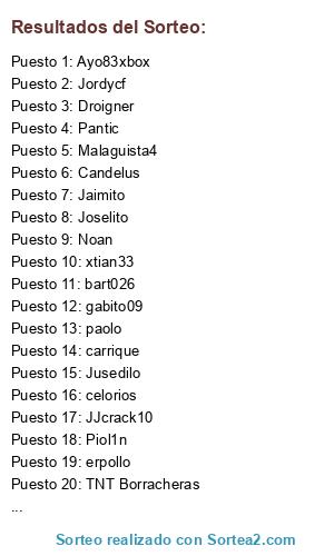 Lista de participantes: paolo, TNT Borracheras, Pantic, mojopikon, Sacro, bart026, Piol1n, celorios, JJcrack10, Ayo83xbox, rayykkonen, Jusedilo, carrique, LinKiN, gabito09, Jordycf, xtian33, erpollo, Jaimito, Joselito, Candelus, Malaguista4, IsraRS, Noan, Droigner.