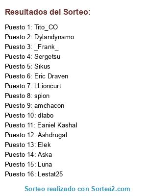 Lista de participantes: Luna, spion, dlabo, _Frank_, Lestat25, Sergetsu, Ashdrugal, Dylandynamo, amchacon, Tito_CO, Sikus, Eric Draven, LLioncurt, Eaniel Kashal, Aska, Elek.