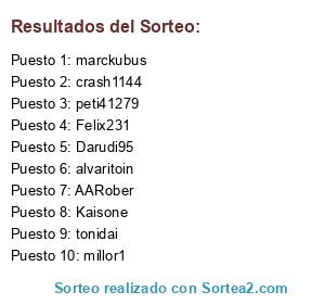 Lista de participantes: Spitz254, chumakervng, hellowbet, xabilunas6, robiyisa, pocholo1979, spaniolul81, mmmmm238, Gadi1303, xeesuus, striker3, pituhuesca, Juanje36, palpal, Sheilacm, Tink777, Guille.37, crash1144, oscar_80, millor1, betiko11, eloyuquies.