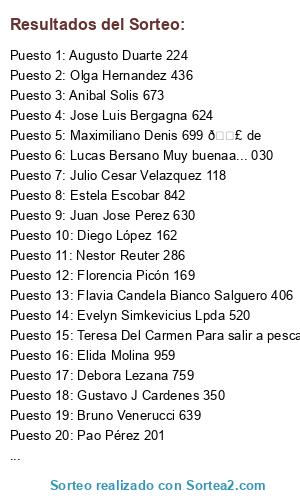 Lista de participantes: Liliana Beatriz Ayala Hermoso 776(2 participaciones), Nicolas Romero 420(2 participaciones), Gustavo J Cardenes 350(2 participaciones), Juan villalba 807(2 participaciones), Danilo Pesca Muy linda lancha 040(2 participaciones), Celeste Piris 123(2 participaciones), Cristina Carpio 368(2 participaciones), Pau Li 134...(2 participaciones), Nene Maciel Buenisimo 811(2 participaciones), Juanjo Colombani 287(2 participaciones), Gerardo Gornati 585(2 participaciones), Elsa Garavano 593(2 participaciones), Patricia Monzon Es mi sueño.163(2 participaciones), Osvaldo Filito 259(2 participaciones), Romina Abrígo Me gusta.. 809(2 participaciones), Lalo Benetti 368(2 participaciones), Manu Frias 483(2 participaciones), Diego Areias 287(2 participaciones), Mar Sevilla 134(2 participaciones), Paula Casaroli guuuuuuuauuuu que buen sorteooo!!!!! 266(2 participaciones), Miguel Echeverria Esta muy bueno 728(2 participaciones), Ezequiel Alza Exelente!!! 😍 😍 737(2 participaciones), Gasti Viva El sueño de mi papá tener una lancha....dni: 000(2 participaciones), Raul Alejandro Diaz 570(2 participaciones), Silvina Modica 224(2 participaciones), Fern Nando L 707(2 participaciones), Marula Bazte 374(2 participaciones), Hugo Coria 674(2 participaciones), Gabriel Fiorante Buenísima 751(2 participaciones), Olga Hernandez 436(2 participaciones), Lucas Romero 250(2 participaciones), Liliana Rey Turienzo Espectacular !!! 754(2 participaciones), Ilda Vilches 582(2 participaciones), Nacho Foppoli 776(2 participaciones), Sergio Ariel Alarcón ,042(2 participaciones), Natalia Irusta 783(2 participaciones), Franco Diaz 852(2 participaciones), Martincho Gomez 412(2 participaciones), Belu Molina 518(2 participaciones), Vane Lau 778 seria una gran sorpresa,poder regalarle a mi marido ya que le encanta ir a pescar!!!(2 participaciones), Pitu Pratti 255(2 participaciones), Raquel Ines Piacenza 262(2 participaciones), Omar Hector Lovera Omar 371(2 participaciones), Hector Ruben Salinas 650(2 participaciones), Claudia Marcela Ludueña 499. Que bueno estaria. #QUIERO Ganar., Flavia Candela Bianco Salguero 406(2 participaciones), Natalia Gonzalez 358(2 participaciones), Matías Schmidt 069(2 participaciones), Valeria Viñas 692(2 participaciones), America Maria Ludueña Vignola 782(2 participaciones), Jorgito Kusik 635(2 participaciones), Ramon Adolfo Vergara es un sueño para mi poder ganarla .465(2 participaciones), Norma Gonzalez 577(2 participaciones), Jorge Molina 089(2 participaciones), Eduardo Palacios Eduardo Palacios 388(2 participaciones), Roberto Luis Rodriguez 516 al agua..(2 participaciones), Virginia Schnell 398(2 participaciones), Juan Ignacio Volpato 175 por donde se sortea?(2 participaciones), Rodrigo Santellan 033 la quiero!(2 participaciones), Norma Riera 351(2 participaciones), Nestor Reuter 286(8 participaciones), Juan Carlos Ortega 482(2 participaciones), Belu Beel 931(2 participaciones), Beto Decoud 698(2 participaciones), Dante Lia 310(2 participaciones), Luciana Bonin 721(2 participaciones), Jorge Verdala 421(2 participaciones), Evelyn Simkevicius Lpda 520(2 participaciones), Stella Maris Debia 549(2 participaciones), Jorge Luis Garcia 264(2 participaciones), Gabriela Villafañe 497(2 participaciones), Andrea Gizich 122(2 participaciones), Pori Barrionuevo 773(2 participaciones), Vilma Bertran 141(2 participaciones), Facundo Agüero Facundo Agüero 565(2 participaciones), Guillermo Viera 654(2 participaciones), Leo Rodriguez 928(2 participaciones), Claudia la Peque 827(2 participaciones), Elida Molina 959(2 participaciones), Carla Stojan 859(2 participaciones), Jesica Venturini 083.(2 participaciones), Barba Negra 447(2 participaciones), Martin Solivella 042(2 participaciones), Susana Calandria Para viajar con mi esposo541(2 participaciones), Mercedes Buzatto 707(2 participaciones), Licenciado Osvaldo Fabián Acevedo Osvaldo Fabián Acevedo 177(2 participaciones), Sebastian C Ruiz Cesar Ruiz 125(2 participaciones), Mïïca Übal q linda q es 683(2 participaciones), Mauro Drozeski 457(2 participaciones), Jorge Kosmatos Me encanta para ir al río de pesca con amigos 105(2 participaciones), Sole Perez 721(2 participaciones), Natalia Perez Para mi marido que ama la isla 243(2 participaciones), Noelia Lujan Cermelli 702 hermosa.(2 participaciones), Beatriz Barrera Hermosa para navegar por el dique 997(2 participaciones), Gaby RG 632(2 participaciones), Blas Reynoso 492(2 participaciones), Franco Peralta Cheli 518(2 participaciones), Jose Gomez Espero tener suerte muy linda ,959(2 participaciones), Daniel Godoy Como nunca gane nada por esta red decido participar 981(2 participaciones), Alcira Arana 551(2 participaciones), Daai Zangla 033(2 participaciones), Luis Sanchez 165(2 participaciones), Fabio Ledesma Para recorrer el Paraná 801(2 participaciones), Victoria Kennedy 009(2 participaciones), Luciana Rivero 591(2 participaciones), Barby Copii 915(2 participaciones), Eliana Dean 623(2 participaciones), Vik Goku Bernal 758 Estaría bueno para el grupo(2 participaciones), Teresa Del Carmen Para salir a pescar 817(2 participaciones), Pablo Martinez Pablo Martínez 382(2 participaciones), Bruno Vader Matías Iturgoyen 163(2 participaciones), Pablo Martínez 382(2 participaciones), Heii Mario Bandera Está muy linda 520(2 participaciones), Guille Sappietro 114. Alto navío(2 participaciones), René Ontiveros 585 de salta. Muy buena(2 participaciones), Matias Ezequiel Goyochea 321(2 participaciones), Raul Alberto Molinari Me encanta 259(2 participaciones), Jose Norberto Cicchetti Muy buena embarcación ojalá me la gane me la merezco abrazos. ..928(2 participaciones), Andrea Alarcon 298(2 participaciones), Luis Cardoso 925(2 participaciones), Sergio Sebastian Hess 48(2 participaciones), Fernando del Valle Hola amigo me encanta la embarcación linda soy de Formosa 300(2 participaciones), Ariel Chavez Soy Ariel Chavez de Ramallo provincia de Buenos Aires 433(2 participaciones), Abel E