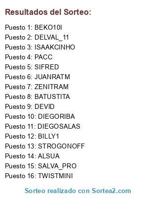Lista de participantes: SIFRED, ISAAKCINHO, ZENITRAM, DEVID, ALSUA, DIEGORIBA, DELVAL_11, BATUSTITA, PACC, STROGONOFF, SALVA_PRO, BILLY1, TWISTMINI, JUANRATM, BEKO10I, DIEGOSALAS.