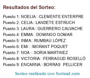 Lista de participantes: SONIA TOMAS CARDONA, TERE FUSTER TORRES, INMA VICENS, ANA ALVAREZ MENGUAL, MARIA BURGUERA MATEO, AMPARO VILLAR PALOMAR, GEMMA MIÑANA MORAGUES, LOLA CLAVIER TOMAS, DESIRE VALENZUELA BERROCAQL, MARIA JOSE CHOVA MARTINEZ, INMA TORRES, MARI ANGELES CARDONA FENOLLAR, LIDIA BUSTILLO PENEDO, SARI MONZO FUSTER, CARLA MORATAL MONZO, INMA MONZO FUSTER, MARIA GARCIA FUERTES, GABRIELA GóMEZ-PIMPOLLO HORCAJADA, PAULA MARTI PEREZ, AINA DEUSA NADAL, MARIA VERDEGUER FERRANDO, ELENA RIBES MATEU, VANESSA PASTOR ESTRUCH, CRISTINA LLINARES, AMPARO GIL PASTOR, RAQUEL DURAN, LOLA ABARGUES LóPEZ, AMPARO VILLORA TORRES, MARIA MORATAL MONZO, PAULA SUAREZ GRIMALT, MARTA GREGORI COMAS, SARA RODRIGUEZ DURAN, SARA FRASQUET MORANT, LUCIA BARDISA DE LA IGLESIA, AMPARO HURTADO BOILS, MAITE TEBAR GARCIA, NEUS ROLDAN MAGAÑA, MARISA JURADO VIDAL, ANA ROLDAN MAGAñA, SOFÍA ESCRIVÁ MARTÍ, BEATRIZ CASTILLO BAÑULS, TERESA CLIMENT BENIMELI, MIRIAM LóPEZ HERRERO, NURIA VILLAPLANA, NEUS VIDAL VILLAPLANA, MARI ALBORS BRIVA, MONTSE ALONSO PALOMINO, MELANIE SIGNES SIERRA, ROSETA VALLS VICEDO, ROSETA BATALLER VALLS, MARIA NIEVES FERRI UREÑA, SUSANA SASTRE, ASCESIóN COLLADO LOPEZ, MILVA MARIA PEREZ MARTI, NEUS APARISI PEREZ, LOLA JUST FUSTER, SILVIA VACA JUST, ESTEFANIA HERRERO MORANT, LAURA GARCIA HERRERO, TRINIDAD SIERRA HUESO, JENNIFER SIGNES SIERRA, EMMA ALEMANY, CRISTINA ALBERT GUEROLA, ANA MARTÍN YESTE, MARU YESTE MARTÍNEZ, PEPA FURIÓ BLASCO, LYS FERRER MARTíN, EVA FAUS PEIRO, LUCÍA FAUS PINEL, CARMEN ROSARIO GAMITO BINCEIRO, GALA LORENTE CáNOVES, ANNA LORENTE CANOVES, PAULA JUST MORANT, ANDREA JUST MORANT, ROSA JUST FUSTER, VICENTA FUSTER FUSTER, MARI LOLA ALBORS BRIVA, LAURA PLANES ALBORS, MARIA TRINIDAD TRINIDAD CANO, INMACULADA TRINIDAD CANO, SALUD MARTINEZ PERIS, CAYETANA SEGUI MARTINEZ, AMPARO BAÑULS BELDA, JÚLIA LÓPEZ BANYULS, RAQUEL VACA JUST, ROSA VACA JUST, AITANA CISCAR ESCRIVA, NEUS CISCAR ESCRIVA, MARIA ESCRIVA ESCRIVA, CELIA ESCRIVA ESCRIVA, BEATRIZ PELLICER SELFA, NATALIA BLASCO LOPEZ, MARTA VALCARCEL BLASCO, MARIA JOSE PEREZ CEBRIAN, VERONICA SAEZ MORATAL, LOURDES MORENO SAEZ, EMILIA GARCÍA MARTINEZ, BEATRIZ TERCERO SEMPERE, M. LUISA PARRADO SANCHO, MAVI NUÑEZ CALABUIG, DEIMANTE ZDONEVICIUTE, MONICA FAUS GARCIA, MARTINA REIG FAUS, BEGOñA MENGUAL MORENO, LUCIA MENGUAL MORENO, EMI MORENO VELLO, CRISTINA FERRER SEBASTIA, SOCORRO LóPEZ RODRíGUEZ, Mª JESUS FAUS JUST, ANA ARTES BLOC, MARTA RIBES GOMAR, NURIA RIBES GOMAR, ISABEL GARCIA MARÍ, BEATRIZ BOIX MORATA, CHELO GOMAR ESTORNELL, CONCHIN GOMAR ESTORNELL, BELEN PRATS GOMAR, INMA PRATS GOMAR, ELENA CLIMENT GOMAR, CARMINA CLIMENT GOMAR, ROSANA GOMAR PRATS, EVA BENAVENT VAYA, ISABEL GREGORI GARCIA, LUCIA JURADO GARCIA, MóNICA FLóREZ RóDENAS, CANDELA PEIRó FLóREZ, ANAïS REIG GREGORI, INES MORILLO, MARI CARMEN VALLÉS SOLER, MARINA ESPINÓS VALLÉS, CARME ESPINÓS VALLÉS, ARACELI SEGUI ALBERT, SUSANA OTERO, ELENA POLOP MIRÓN, MONICA CRISTINA MATZANKE JAKOBES, SILVIA BERTOMEU BARTUAL, EMPAR BARTUAL FERRIOL, ANA VICTORIA GóMEZ KING, NEREA ROMERO GóMEZ, PASION HORTELANO REDONDO, NURIA CABANILLES HORTELANO, LORENA QUISPE IRIGOYEN, MARISOL QUISPE IRIGOYEN, CRISTINA SANFELIX MARTI, ANA PART SEGUI, Mª JOSé MARTíNEZ MORATó, ROSA MARTíNEZ MORATó, INÉS CANALES CATALÁ, MARTA CANALES CATALÁ, VIRGINIA CAMARENA DIAZ, GENO CATALÁ BUSTOS, TRINIDAD MORAGUES NOVELL, CAROLINA LLOPIS MORAGUES, MAEVA MAUROY LLOPIS, NOELIA LLOPIS MORAGUES, NORA PONS LLOPIS, ROSA PARREÑO SANCHEZ, ADRIANA ESTRUCH GREGORI, DÉBORA BENAVENT CHOVA, ALMUDENA PEREZ SANJUAN, ELVIRA MAURELL VIDAL, SILVIA ALÓS FIGÁS, AITANA MILLÁN BENAVENT, ANNA PONS PELLICER, ANA MAGRANER RODRIGUEZ, ROSA IBIZA ESTRUCH, NURIA SIMO PELLICER, LAURA SANCRISTOBAL SIMO, TERESA SIMO PELLICER, CRISTINA MAñEZ SIMO, ENCARNA PUIG ESCRIVA, TERESA MARIA RUFAT ESTRUCH, ARACELI ZAFRA RUFAT, PEPA VIVES MARTíNEZ, FANI GONZALEZ MOLINA, AITANA BOSCA GONZáLEZ, MERCEDES FUSTER MORAGUES, M.ANGELES ESTEVE MORATAL, LUCíA YAGüE MAYANS, CLAUDIA ESCRIVá YAGüE, MAYTE CATALA MARTI, ANDREA BALBASTRE CATALA, SILVIA IGLESIAS AUSINA, ANA JIMéNEZ CLIMENT, LIDIA LOPEZ SANZ, INMA BATALLER MURCIA, NIEVES TOMAS SERRANO, LOURDES NAVARRO TEBAR, NURIA ARENAS PEIRO, IRENE FRASQUET ARENAS, NIEVES PEIRO PUIG, ANDREA ESTRUCH ARTES, CRISTINA ARGUDO NAVARRO, LORENA JUST MORATAL, NOEMI VACAS PEREZ, ELENA VILLANUEVA PEREZ, MªCARMEN VALCARCEL MORENO, ISABEL MARTINEZ BARON, LAURA TAMUREJO MARTINEZ, LAURA MOLINA PUIG, ROSARIO PUIG SANSIXTO, MILA PARDO ESTEBAN, NOELIA FAUS PARDO, MARIA REMEDIOS RUBIO CHAVELI, PAULA LLAVADOR RUBIO, INMACULADA BORRULL LLORET, RAQUEL COSCOLLA CANTUS, MONICA COSCOLLA CANTUS, Mª ISABEL BENÍTEZ CERCÓS, LAURA RUIZ VILLALBA, ANNA JUAN JORDáN, Mª VICENTA MONZO MONZO, NATI MONZO MONZO, ANTO CANALES MARTINEZ, JESSI MORA CASAMIAN, Mª TERESA SEMPERE GUARNER, ROSA VIDAL MALONDA, ESTHER GOMéZ VIDAL, SILVIA SANLORENZO PRATS, MERCEDES PRATS ALBORCH, PILAR SANCHEZ MORA, MARISA MARCO MARTI, ANTONIA MARTORELL GIL, ALEJANDRA GARCíA FERNáNDEZ-GALLEGO, Mª GLORIA MAÑÓ SUÁREZ, AMPARO FAUS MASCARELL, MARI ANGELS CANET ESTEVE, JUANA SANCHO MORATAL, EVA MARIA GAVILÁ MARTÍNEZ, NIEVES LLORET ALMIÑANA, ANDREA MAHIQUES LLORET, ROSA APARISI ARTES, SONIA BORRAS SUÑER, SONIA DONET FLORES, CIRILA FLORES RAMOS, SOFíA PEREZ DONET, MARTA MORMENEO BELTRAN, MARIAN VILA SANZ, Mª CARMEN PEIRO, NURIA MIRET PELLICER, MARIA JOSÉ MIRET PELLICER, BEA SOLDEVILA MIRET, ESTEFANIA CAMACHO FEMENIA, SONIA CUENCA TUR, MARTA TUR RODRIGUEZ, Mª DOLORES PEñALVER GINER, GAL.LA MéNDEZ PEñALVER, PAQUI PLANELLS AMO, MARIA BENITEZ PLANELLS, MARIA TERESA BLANCO AYLAGAS, EME MARTíNEZ GOMAR, LAURA MARTíNEZ GOMAR, EME MALONDA MARTíNEZ, ESMERALDA CAMARASA BENAVENTE, MAITE GOMAR MORANT, NOELIA ROMERO CABELLO, LAURA MICO MUñOZ, LOLA FUSTER MILLET, INMA SEGURA MENGUAL, GEMMA PEIRO SALVA, MARTA CATALA OLTRA, RAQUEL BESARI JIMéNEZ, CONSUELO OROVAY MONTANER, NURIA ARBONA OROVAY, OLGA PEñALVER GINER, ALMA MILVAQUES