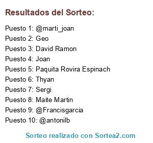 Lista de participantes: Markin’s, Eduard Paradis i Castellà, Jordi, Thyan, Maria, Sergi, Cristian, Gemma, Enric Rius, Xavi, Maite Martin, Albert Flotats, Joan, Gerard, David Ramon, Adrià, Anna, Geo, Montse, Paquita Rovira Espinach, Jordi Portet, @NatxoBCN, @marti_joan, @AlbaMetge, @girbaldel94, @antonilb, @RubenRamiro, @Francisgarcia, @Monicalabart, @marcaurelinieto.