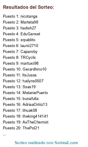 Lista de participantes: muriburyland (6), d4v1d73 (6), bunafulla (6), AdriaaOrtiiz13 (6), Miremax2 (6), martuxii98 (6), illouri38 (5), HectorPro15 (6), Guillempoke2014 (6), illouri385 (5), Marteta98 (6), ItsJusss (5), punil0w (5), chechar74 (5), Frankinvernon (5), Gerardhino10 (5), MelaniePuerto (5), granbalduc (5), lSombra (5), roxer1225 (4), AxTheChemist (5), BOLotaz04 (5), nicotanga (4), soytuamigo (5), DragonmarcZ (5), bryansittoh (5), GalloperExceed (3), lauriii2710 (3), yaaariiitaaa (3), politogames77 (3), Lupitacuervo (3), srpablito (3), djsers (3), theblackbuzzer (3), Daykeywa (3), beta (3), TRCyclic (3), Layd0615 (3), ThePol21Jr (3), AnnaMireia (3), theking414141 (3), ThePol21 (3), Xenok5 (3), bertita (1), RicardoChL (3), rxcs00 (3), IttzKappa (3), Kegrion (3), PolBoom77 (3), Mistercrock (1), Aleixestrella77 (3), Aina0428 (3), Margi301203 (3), jordiajjrr (3), nwnix (3), Eloi0609 (1), Ssas245 (3), liberador7 (3), hadish27 (3), SrSopabuena (3), xMisantropo (3), Faltapro (3), JimiMKX (3), WonsWanted (3), ErTitoVaske (3), Sierras1 (3), redihop (3), Alxem (3), Skweed111 (3), Kenox (3), Cion2025 (3), iBerny38 (3), IlloBerny (3), saramaresp (3), TheBernyBBA (3), nuriacbt77 (3), SirVaz2 (3), Jacobverfer (3), albertussh (1), Xordi (1), Lookie779 (1), madebylily6 (1), blandome47sort (1), poksas (1), saangin (1), Rubron (1), Pakaramacho (1), goyogem (1), toixo (1), EduGanxet (1), mekkaniviar (1), sergifv (1), Estherock (1), At4l4y4 (1), adrialolo (1), MaykaGC (1), Ssas19 (1), MARCGANXET (1), srsalvagimenez (1), Keox195 (1), Xenok5G (1), pokexp19 (1), Noelle (1), lihuak08 (1), prote1993 (1), sulegotte90 (1), Adriano2804 (1), melocoton9 (1), XiquetdeReus (1), jowwy99 (1), TitusGrabu (1), Tonite13 (1), kaiusko (1), Caparoby (1), ItsJB363 (1), tparalc (1), RamyGame (1), hailyns0507 (1), NekoCientifico (1), ShadowM20 (1), Lligaboscs (1), JosepM1949 (1), xon289 (1), naabiio (1), Shiwy (1), PokeEssaadi (1).