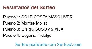 Lista de participantes: Anna Costa Medina, Anna Homs Comajuan, ANTONI TARRATS, ANTONI VIÑAS, Antònia Martínez Lleonart, Araceli Marti, Assumpta, Carlos, Carme Carabi Brunat, Carme Cirera Roset, Carme Francoli Casas, Carme oller, Carmen Redondo Moya, Consol Jorge Sevilla, Conxita cutrina verdaguer, Conxita Molist Serra, David Serrat, DAVID SERRAT CONGOST, DOLORS MASRAMON, Dolors Solanas Roca, Empar Sotodosos, ENRIC BUSOMS VILA, Ernest Serratosa, Estanislao Requena, Eugenia Hidalgo, Fina Trigo Gay, Francesc Pasamonte Mirabet, Francesc Perez, Francesc Valverde Ruiz, Francesca Serrano Montijano, Genis Espelt Sala, Gloria Armengou i Pila, Ildefons Noguera Moreta, Isabel bassas bosch, Jaume Carbonell Vicens, Javi Echarri, Joan Doucluso ( client Elena ), Joaquima Forcada Casas, Jordi Fàbregas Casulà, Jordi Puigblanque Vilardell, Jordi Suñer, Josefina Heras, JOSEP BARNIOL LLIMOS, Josep Cirera, Josep M Fabrega Font - Mercè Solanich Bartroli, josep m. creixans angordans, Josep Padrós Escarrà, Josep Ristol, Josep Roviró, Josep Sabata Capdevila, Josep Vidal Boleda, Laura Pujadas, Lourdes Bruch, MAGDA UREÑAHUESO, Manel Simon Salla, Manuela Vallejo Ortega, MARIA ANGELS SEGALÉS SERRA, maria autonell vilalta, Maria Bague, Maria Carme Almato, Maria Carme Montanya, Maria Carol Devesa, Maria Dolors Puig, Maria Gloria Arimany, Maria Goretti vila sanglas, Maria Josefa Mas, Maria Orra Masó, Maria Parramon Gurt, Maria TEresa Gimbert, Marina Arguelles, mARITA tERESA gIMBERT, Marta Colomer Codinachs, Marta Prat Vilardell, Mayte Gallifa, Mili Ylla, Miquel Masallera, Miquel MOlist BAch, Miquel PUjol, Mireia Soler Ibáñez, Monts REIG, Montse Molist, Montserrat Canamases Casanovas, Montserrat Romeu, Nuria Vidal, Olga Gonzalez, Pere Font Caro, Pere Pou Comas, Rafael Codina Calvet, RAMON ARINO GONZALEZ, ROSA CARDONER, Rosa Maria Criballers, SOLE COSTA MASOLIVER, Tere Riera Taulats, Teresa Aragonès Viñes, TERESA CONDOM PUIG, TRINI SOLVAS, JOSEP RIERA, Xavier Febrer Claveras, Xavier JANÉ, Xavier Subirà Lorenzo, Francesc Paracolls, Felip Casajoana, Cristina Zafra, Maria Carme Novell, Francesc LLorens Arceda, Salvador Pujol Bou, Esteve Torrellas Masdeu, Jesus Gimenez Canudas, Valentin Platero Jurado, Susana Costa Carrillo, Irene Colomer, Carme Cabana Vera, Antoni Pujadas, Manel Florensa, Montse Salom, Imma Jufre Bigas.