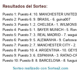 Lista de participantes: Puesto 1: 2. CHELSEA - 1. WILMONSTRO , Puesto 2: 7. MANCHESTER CITY - 2. JORGE_SJP, Puesto 3: 6. ESPANHA - 3. RATAO-CRZ, Puesto 4: 10. MANCHESTER UNITED - 4. dheypablo, Puesto 5: 1. BAYER MUNICH - 5. RonnieMarinho, Puesto 6: 9. BRASIL - 6. guina007, Puesto 7: 3. REAL MADRID - 7. waguinho-joga10, Puesto 8: 8. BARCELONA - 8. fusguinha, Puesto 9: 5. ALEMANHA - 9. Carlosvasco2011, Puesto 10: 4. ARGENTINA - 10. GEYSON7.
