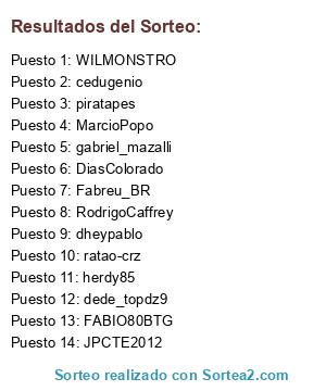 Lista de participantes: RodrigoCaffrey, WILMONSTRO, gabriel_mazalli, JPCTE2012, FABIO80BTG, MarcioPopo, Fabreu_BR, herdy85, piratapes, DiasColorado, dheypablo, ratao-crz, dede_topdz9, cedugenio.