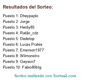 Lista de participantes: Herdy85, Geyson7, Wilmonstro, Jorge, Ratão_cdz, Fabio80btg, Dheypaplo, Dedetop, Lucas Prates, Emerson1977.