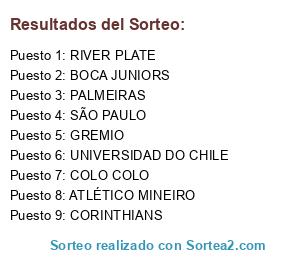 Lista de participantes: CORINTHIANS, RIVER PLATE, SÃO PAULO, COLO COLO, BOCA JUNIORS, ATLÉTICO MINEIRO, UNIVERSIDAD DO CHILE, PALMEIRAS, GREMIO.
