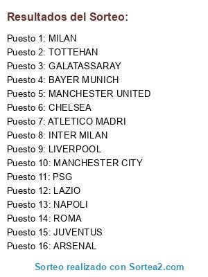 Lista de participantes: BAYER MUNICH, NAPOLI, PSG, TOTTEHAN, MILAN, MANCHESTER CITY, MANCHESTER UNITED, LIVERPOOL, CHELSEA, JUVENTUS, INTER MILAN, GALATASSARAY, LAZIO, ATLETICO MADRI, ARSENAL, ROMA.