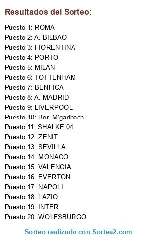 Lista de participantes: Bor. M'gadbach, SHALKE 04, WOLFSBURGO, A. BILBAO, VALENCIA, SEVILLA, MONACO, EVERTON, LIVERPOOL, TOTTENHAM, MILAN, FIORENTINA, INTER, NAPOLI, ROMA, LAZIO, ZENIT, PORTO, BENFICA, A. MADRID.