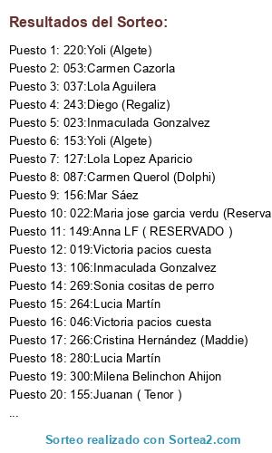 Lista de participantes: 001:Alfonso Martín, 002:Victoria Salvan (Zaida), 003:Carmen Cazorla, 004:Lucia Martín, 005:Inmaculada Gonzalvez, 006:Carmen Querol (Dolphi), 007:Carmen Rodríguez Blanes, 008:Sara Piñeiro Glez., 009:Victoria Pacios Cuesta, 010:Carmen Querol (Dolphi), 011:Carmen Querol (Dolphi), 012:Juanan ( Tenor ), 013:Mari Jose Garcia Verdu (Reservado ), 014:Carmen Querol (Dolphi), 015:Luis Miguel Segura (Delfin), 016:Alfonso Martín, 017:Inmaculada Gonzalvez, 018:Mar Sáez, 019:Victoria pacios cuesta, 020:Yoli (Algete), 021:Sonia Valdetorres ( RESERVADO), 022:Maria jose garcia verdu (Reservado), 023:Inmaculada Gonzalvez, 024:Victoria pacios cuesta, 025:Victoria Salvan (Zaida), 026:Lola Lopez Aparicio, 027:Concha Blanco, 028:Lola Lopez Aparicio, 029:Silvia (gatubela), 030:Sara Piñeiro Glez., 031:Carmen Cazorla, 032:Lola Aguilera, 033:Lola Aguilera, 034:Lola Aguilera, 035:Lola Aguilera, 036:Lola Aguilera, 037:Lola Aguilera, 038:Lola Aguilera, 039:Lola Aguilera, 040:Lola Aguilera, 041:Lola Aguilera, 042:Lola Aguilera, 043:Lola Aguilera, 044:Maria jose garcia verdu (Reservado), 045:Lola Aguilera, 046:Victoria pacios cuesta, 047:Victoria pacios cuesta, 048:Lucia Martín, 049:Carmen Querol (Dolphi), 050:Victoria Salvan (Zaida), 051:Victoria Salvan (Zaida), 052:Juanan ( Tenor ), 053:Carmen Cazorla, 054:Carmen Rodríguez Blanes, 055:Milena Belinchon Ahijon, 056:Yoli (Algete), 057:Carmen Querol (Dolphi), 058:Lola Lopez Aparicio, 059:Sara Piñeiro Glez., 060:Mar Sáez, 061:Antonio Lozano, 062:Silvia (gatubela), 063:Carmen Cazorla, 064:Alfonso Martín, 065:Anna LF ( RESERVADO ), 066:Inmaculada Gonzalvez, 067:Carmen Rodríguez Blanes, 068:Anna LF ( RESERVADO ), 069:Lucia Martín, 070:Sonia Valdetorres ( RESERVADO), 071:Carmen Querol (Dolphi), 072:Carmen Querol (Dolphi), 073:Lucia Martín, 074:Juanan ( Tenor ), 075:Juanan ( Tenor ), 076:Lola Lopez Aparicio, 077:Anna LF ( RESERVADO ), 078:Carmen Cazorla, 079;Alfonso Martín, 080:Anna LF ( RESERVADO ), 081:Anna LF ( RESERVADO ), 082:Alfonso Martín, 083:Diego (Regaliz), 084:Paloma (Talamanca), 085:Yoli (Algete), 086:Silvia (gatubela), 087:Carmen Querol (Dolphi), 088:Alfonso Martín, 089:Sonia cositas de perro, 090:Carmen Rodríguez Blanes, 091:Mar Sáez, 092:Alfonso Martín, 093:Victoria Salvan (Zaida), 094:Diego (Regaliz), 095:Lola Lopez Aparicio, 096:Carmen Querol (Dolphi), 097:Carmen Querol (Dolphi), 098:Alfonso Martín, 099:Lola Lopez Aparicio, 100:Juanan ( Tenor ), 101:Milena Belinchon Ahijon, 102:Carmen Rodríguez Blanes, 103:Lola Lopez Aparicio, 104:Alfonso Martín, 105:Carmen Cazorla, 106:Inmaculada Gonzalvez, 107:Paloma (Talamanca), 108:Anna LF ( RESERVADO ), 109:Alfonso Martín, 110:Alfonso Martín, 111:Sara Piñeiro Glez., 112:Sara Piñeiro Glez., 113 Mar Sáez, 114:Carmen Querol (Dolphi), 115:Victoria Salvan (Zaida), 116:Anna LF ( RESERVADO ), 117:Anna LF ( RESERVADO ), 118:Carmen Rodríguez Blanes, 119:Carmen Cazorla, 120:Carmen Querol (Dolphi), 121:Yoli (Algete), 122:Carmen Rodríguez Blanes, 123:Alfonso Martín, 124:Carmen Querol (Dolphi), 125:Sonia Valdetorres ( RESERVADO), 126:Victoria Salvan (Zaida), 127:Lola Lopez Aparicio, 128:Carmen Cazorla, 129:Carmen Rodríguez Blanes, 130:Carmen Querol (Dolphi), 131:Diego (Regaliz), 132:Carmen Rodríguez Blanes, 133:Carmen Rodríguez Blanes, 134:Mar Sáez, 135:Alfonso Martín, 136:Alfonso Martín, 137:Diego (Regaliz), 138:Victoria Salvan (Zaida), 139:Inmaculada Gonzalvez, 140:Antonio Lozano, 141:Carmen Querol (Dolphi), 142:Diego (Regaliz), 143:Mar Sáez, 144:Carmen Cazorla, 145:Diego (Regaliz), 146:Lola Lopez Aparicio, 147:Diego (Regaliz), 148:Alfonso Martín, 149:Anna LF ( RESERVADO ), 150:Mar Sáez, 151:Belén Ordoñez, 152:Victoria Salvan (Zaida), 153:Yoli (Algete), 154:Yoli (Algete), 155:Juanan ( Tenor ), 156:Mar Sáez, 157:Luis Miguel Segura (Delfin), 158:Carmen Querol (Dolphi), 159:Anna LF ( RESERVADO ), 160:Alfonso Martín, 161:Anna LF ( RESERVADO ), 162:Diego (Regaliz), 163:Carmen Cazorla, 164:Lola Aguilera, 165:Lola Aguilera, 166:Lola Aguilera, 167:Lola Aguilera, 168:Lola Aguilera, 169:Lola Aguilera, 170:Lola Aguilera, 171:Lola Aguilera, 172:Lola Aguilera, 173:Lola Aguilera, 174:Lola Aguilera, 175:Lola Aguilera, 176:Juanan ( Tenor ), 177:Sonia Valdetorres ( RESERVADO), 178:Inmaculada Gonzalvez, 179:Alfonso Martín, 180:Alfonso Martín, 181:Antonio Lozano, 182:Paloma (Talamanca), 183:Carmen Querol (Dolphi), 184:Diego (Regaliz), 185:Juanan ( Tenor ), 186:Inmaculada Gonzalvez, 187:Inmaculada Gonzalvez, 188:Mar Sáez, 189:Sonia cositas de perro, 190:Sonia Valdetorres ( RESERVADO), 191:Maria jose garcia verdu ( Reservado ), 192:Alfonso Martín, 193:Juanan ( Tenor ), 194:Juanan ( Tenor ), 195:Lucia Martín, 196:Carmen Querol (Dolphi), 197:Inmaculada Gonzalvez, 198:Victoria Salvan (Zaida), 199:Alfonso Martín, 200:Carmen Querol (Dolphi), 201:Lola Lopez Aparicio, 202:Maria jose garcia verdu ( Reservado ), 203:Yoli (Algete), 204:Belén Ordoñez, 205:Cristina Hernández (Maddie), 206:Cristina Hernández (Maddie), 207:Anna LF ( RESERVADO ), 208:Diego (Regaliz), 209:Sonia cositas de perro, 210:Cristina Hernández (Maddie), 211:Yoli (Algete), 212:Cristina Hernández (Maddie), 213:Cristina Hernández (Maddie), 214:Lola Lopez Aparicio, 215:Anna LF ( RESERVADO ), 216:Mar Sáez, 217:Mar Sáez, 218:Anna LF ( RESERVADO ), 219:Silvia (gatubela), 220:Yoli (Algete), 221:Belén Ordoñez, 222:Belén Ordoñez, 223:Cristina Hernández (Maddie), 224:Cristina Hernández (Maddie), 225:Belén Ordoñez, 226:Sonia cositas de perro, 227:Mar Sáez, 228:Cristina Hernández (Maddie), 229:Mar Sáez, 230:Lola Lopez Aparicio, 231:Belén Ordoñez, 232:Cristina Hernández (Maddie), 233:Cristina Hernández (Maddie), 234:Cristina Hernández (Maddie), 235:Antonio e Isabel, 236:Anna LF ( RESERVADO ), 237:Cristina Hernández (Maddie), 238:Rafael Tunon Sanchez, 239:Cristina Hernández (Maddie), 240:Cristina Hernández (Maddie), 241:Mar Sáez, 242:Sonia Valdetorres ( RESERVADO), 243:Diego (Regaliz), 244:Diego (Regaliz),