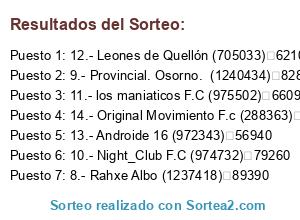 Lista de participantes: 6.- CF Osorno Rovers 09 (1239712) 96020, 7.- Castro_FC (967988) 90710, 8.- Rahxe Albo (1237418) 89390, 9.- Provincial. Osorno. (1240434) 82810, 10.- Night_Club F.C (974732) 79260.