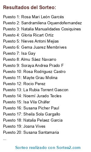 Lista de participantes: Maite Peralta Bas, Nur DelaFuente, Joana Vives, Pedro Sole Oscar Marta Lopez, Reme Borras Garcia, Los Hilos de Kala, Gloria Ricart Ortiz, Anna Mingarro Mezquita, Ruth Sanz Monroig, Carolina De Arnáiz Martin, Sandramilena Oquendofernandez, Cristina Camps Sierra, Beatriz Fernandez Conde, Carmen Segui Torres, Mari Carmen Ignacio Bedmar, Monica Bestit Perez, Loreta Sanchis, Elena Maria Fernandez Conde, Rosa Rodriguez Castro, Esther Gonzalez, Pilar Diaz Perez, Gema Juarez Membrives, Natalia Pelaez Garcia, Natalia Manualidades Cosiquines, Susana Santamaria, Vincenzo Rod Gom, Vane Hellcat, Jovana Gonzalez Aznar, Zeta Valbar, Carolina Avila, Isa Gay, Paloma Arlandis Beltrán, Patry Aguilar Llopis, Neu E Tes, Nerea Soto Mingarro, Maria Pilar, Arancha Sogorb Navarro, Ana Sales Martinez, Carmina Gil Garcia, Esther Navarro Lopez, Sonia Monzonis, Silvia Domenech, Verónica Naranjo Bea, Neus Ibáñez Tomás, Maria Jose Mateo Segarra, Maria Torralba Arnau, Tamara Doñate, Eva Miceli Branca, Pilar Maravilla Fornas, María Pablo Familia Serrano, Noelia Roca Bolumar, Cristina Gómez, Soriano Pitarch Verónica, Nancy Soriano Mateo, Andra Fusa Mut, Massiel Bautista, Maria Miravet Leonés, Ram Puertasbelinchon, Cristina Clavero, Alba Cerda Hernandez, Elena Gasulla, Soraya Andrea Prado F, Mayte Grau Molina, Elia Rogla Romero, Isa Vila Cháfer, Raquel Paradis Ferrer, Javier Cirujeda, Marta Collado Vidal, Sheila Sola Gargallo, Amelia Gallart Garcia, Pep Ferrando Gonzalez, Maria Jose Herrero, Aldahara Rodriguez, Iris Paradís Leopori, Yaiza Gonzalez, Ivan Arnau Cano, Paula Galan Saiz, Koral's Xilxes, Nuria Barres Gavara, Vanesa Masiá, Thais Sanchez Lopez, Rocio Perez, Elena Maravilla Fornas, Maria Moral Rodriguez, Dulce Quesada Peñalver, Mar Recatala, Vanesa Valenzuela Matarredona, Samanta Fernández Soriano, Almudena Cuello Gas, Anna Muñoz Barelles, David Gómez, Maria Jose Monzonis Antonio, Administrador, Isa Casquet Gómez, Arantxa Mondragón, Lorena Fm, Ana Guerrero Serena, La Rubia Torrent Gascon, Jara Beltran Soriano, Mònica Sola, Cristina Montosa Alonso, Dinamita Dimanita, July Mera Moreira, Sonia Martinez Ratia, Estela García, Ruben Martin Sorribes, Lauralala Lala, Patry Santana Aguilar, Eloisa Albalat Lopez, Beatriz Garcia Leon, Abelardo Fortea Sanchis, Almu Sàez Navarro, Floren Mateo, Marc Palomero, Noemí Jurado Tecles, Fran Molina, Estefania Fernandez Cherta, Minerva Pintado Marin, Laura Fonfria Ortiz, Susana Picher Paul, Rosa Mari León Garcés, Pilar Barreda Mora, Mari Torres, Pilar Sierra Sánchez, Lino Gago Leñador, Laura Valero, Mariluz Membrillas, Nieves Antoni Mejias, Helena Mondragón Llorca, Miriam Eixea Urquiza, Fátima Cuéllar Salinas, Paloma Villalba de Toro.