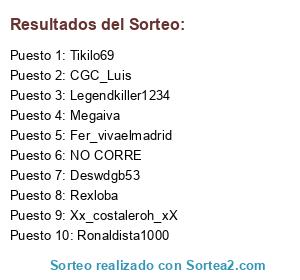 Lista de participantes: Tikilo69, CGC_Luis, Deswdgb53, Fer_vivaelmadrid, Legendkiller1234, Megaiva, Rexloba, Ronaldista1000, Xx_costaleroh_xX, NO CORRE.