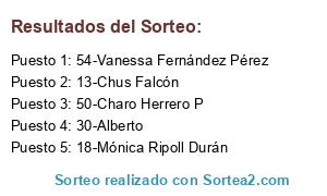 Lista de participantes: 1-Pilar García, 2-María Rosa Fernández, 3-Laura Grande Pereiro, 4-Alejandría, 5-Alejandra Hernández, 6-Federico Álvarez, 7-María Víllora, 8-Saray Calvo, 9-Jesús López, 10-Sonia Fernández, 11-Nuria Fernández, 12-Lorena, 13-Chus Falcón, 14-Esperanza, 15-Sonia Sobrino de Mingo, 16-Angélica, 17-Eugenia Morán, 18-Mónica Ripoll Durán, 19-Javi Bao, 20-Pablo Castro, 21-Teresa García, 22-Carmen Loren, 23-Julio Malavida, 24-Deibiz, 25-Mar Alonso, 26-Catherine, 27-Iagof, 28-Victoria, 29-Mar Robles, 30-Alberto, 31-Loli Gaitán Paton, 32-Juan Antonio, 33-María Teresa García Martín, 34-Catalina Talavera Moreno, 35-Victoria Aceña, 36-Carmen García, 37-Natalia Prieto García, 38-Maite Sevilla, 39-Claudia, 40-Inés Rocha, 41-Elena Burgos, 42-Mónica Casas Angullo, 43-Inés DG, 44-Laura López, 45-Priscila, 46-Ana DeBlogs, 47-Lourdes Dinares, 48-David Sánchez, 49-Sergio, 50-Charo Herrero P, 51-Susana Tezanos, 52-Iosu Andía, 53-Silvia Bartolomé, 54-Vanessa Fernández Pérez, 55-Nuria Macías García, 56-Rosa María Camacho, 57-Irene Masip Morte, 58-Zulema Pontes Vidal, 59-Ana Bertol, 60-Flor BG.