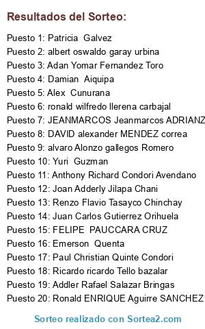Lista de participantes: Julio Cesar Manrique Ruiz, Ronald Paul Ipanaqué Bedon, Maykool Palza camere, Sebastian Lindley, Nestor Luis Barrera Risco, Pedro Navarro, Yener olmedo Obeso obeso, Egdannyeli Joseliann Hernandez Araque, Alexis Jesus Buendia Arancibia, Lenin Omar Vargas Vilca, Herson rafael Bernaola huayanay, Summer llamoca, Alexis Jesus Buendia Arancibia, Jaaziel Dickson Bernaola Diaz, Alexis Jesus Buendia Arancibia, Walter Oscar Cutipa Calcina, Jose Antonio Gamboa Alva, Angel Samuel Rugel Alva, Carlos Jorge Miranda Basauri, Carlos Jorge Miranda Basauri, Carlos Jorge Miranda Basauri, Carlos Jorge Miranda Basauri, Jheferson Alberto Panduro Callupe, Carlos Alberto Bruno Sernaque, Eduardo RAFAEL Jara ESPEJO, Sonia Rocio Dezavala Chang, Epifanio Ruiz astoray, FELIPE PAUCCARA CRUZ, FELIPE PAUCCARA CRUZ, FELIPE PAUCCARA CRUZ, FELIPE PAUCCARA CRUZ, alex aranguena, alex aranguena, Sonia Rocio Dezavala Chang, Leodan Mejia Chavez, deivys Leomar gallardo, Alcides Guillen Herrera, Juvenal R, Grecia Llatas, Joseph Renato Perez Ramirez, Mexer Armando Arcela Correa, Guillermo Miranda Sosa, Guillermo Miranda Sosa, Guillermo Miranda Sosa, Guillermo Miranda Sosa, Guillermo Miranda Sosa, Guillermo Miranda Sosa, Guillermo Miranda Sosa, Guillermo Miranda Sosa, Guillermo Miranda Sosa, Guillermo Miranda Sosa, Guillermo Miranda Sosa, Guillermo Miranda Sosa, Pavel Edy Espinoza Guillen, ALBERTO YUPANQUI Ramos, Pavel Edy Espinoza Guillen, Paulo CESAR argote VALLE, VICTOR AREVALO PEREZ, Jorge Arias, Geraldin Mercedes Machuca Lobaton, Javier Enrique Mallqui Bravo, Epifanio Ruiz astoray, Alfredo Sarayasi, Alfredo Sarayasi, alex aranguena, Jhonatan Ruiz, alex aranguena, alex aranguena, Junior Munoz, Boriss fernando Fernandez Najar, Anibal Delgado, Marlen Brayer Casado Torres, Alexis Jesus Buendia Arancibia, Sandra Janette Nuñez Bornas, Jose Antonio Vicente Elescano, Deovy sabino Ramos leon, Carlos Jorge Miranda Basauri, Jenry edmundo Tapara espinoza, Ademir Rene Yovera Yacolca, Charly CHARLY Huaman PERALTA, Jimmy Darwin Sanz Chavez, Pedro Navarro, Juan Nicolas Vivanco Fajardo, Henry Silva, Alcides Guillen Herrera, Pavel Edy Espinoza Guillen, Jose Antonio Gamboa Alva, David david Miranda palacios, Jim Delacruz, Roberth Jose Carreno Suarez, VICTOR AREVALO PEREZ, Natali Pamela Becerra Insua, Angel Gabriel Delacruz Cancho, Josua Oruna, Alexis Jesus Buendia Arancibia, alexander alexander apaza barrantes, Romulo Mamani, Dan Paul Kanashiro Arakaki, Danny Giovanni Echenique Arevalo, Richard Roberto Pariamachi Calla, Gerardo Arturo Ortiz Ortiz, Gerardo Arturo Ortiz Ortiz, Kathy ESTHEFANY García RODRIGUEZ, Robert Daniel Campbell Parodi, romario Gerson cavero Camat, Edison Paul Mendoza Cordova, Jordy samir Flores Ortiz, Didier Marin, Alan moises Bringas laguado, Carlos marcos Barreda zegarra, Elder Layza, Jose Antonio Gamboa Alva, Jose Antonio Gamboa Alva, Frank Canchari, Julio Coaguila, Angel Frank Cardenas Inapi, Josua Oruna, Santos Smith Mora Balbin, Jorge Richard Huamán Herencia, Jeyson Roncal, Ciro Cesar Aroni Caceres, Cesar Dariel Juarez Polo, Reuteman Reuteman Ruiz Zevallos, Roberth Jose Carreno Suarez, Jilmar Danilo Nunez Zegarra, gabriel fuentes fuentes, gabriel fuentes fuentes, Diego Pablo Cedano Sato, JOSE ARANA, Junior Munoz, Eliazar Mendoza Gutierrez, Eliazar Mendoza Gutierrez, Eliazar Mendoza Gutierrez, Victor Pilade Callegari Portal, Paco Miguel Peralta Gleiser, samuel castillo castillo, Jose Mejia, nilton Montenegro Herrera, Galo enrique Weir ocampo, Denis PELAGIO Quispe VILA, Merwin Atencio, cesar aguirre Figueroa, Daniel Anderson Vives Condor, Robert Michael Caso Yupanqui, Frank Jhonatan Herrers Carrillo, Frank Jhonatan Herrers Carrillo, Carlos marcos Barreda zegarra, Jhonny Huayhua Abregu, Dan Paul Kanashiro Arakaki, Pavel Edy Espinoza Guillen, Eduardo RAFAEL Jara ESPEJO, Jeremy delpiero Carrillo Ferreyra, Jeremy delpiero Carrillo Ferreyra, Jesus Santos, Pavel Edy Espinoza Guillen, Daniel Anderson Vives Condor, kristian Valencia, Moises jonathan Llacchua julca, Brandon Zelada, Guillermo Nazario, Brandon Zelada, Eliser Sanchez, Brandon Zelada, Henry Luis Pozo Nolberto, Xavier Pinedo, Xavier Pinedo, Xavier Pinedo, Junior Munoz, alex aranguena, alex aranguena, Carlos miguel Moreno Gonzales, Deovy sabino Ramos leon, Luis Antonio Silva Silva, Sergio Veramendi, Juan Carlos Gutierrez Orihuela, Delmira ortiz Cierto, Juan Carlos Gutierrez Orihuela, Cristhian Yalle, Sergio Veramendi, Alberto Jesus Arestegui Catacora, Elder Layza, Elder Layza, Eduardo RAFAEL Jara ESPEJO, Lesly Zevallos, Ivan Miranda, Maria Maria Chirinos Calixtro, Gino Ghiggo, Juan Carlos Gutierrez Orihuela, vilner antonio velasquez pascual, Lenin Omar Vargas Vilca, Oswaldo Flores Castro, Giuseppe Larino Arisaca, Denis PELAGIO Quispe VILA, Jilmar Danilo Nunez Zegarra, Michael Joe Fernandez Cuayla, Kevin Yurixo Huaman Garcia, Omar Montoya, juan Carlos canelo Veracierta, Yener olmedo Obeso obeso, TERRY Leonardo GONZALES Calderon, Jianbin Lei, Alexis Jesus Buendia Arancibia, Jorge luis Gamarra carbonel, Frank Romero, Rodolfo Venero Espinoza, Jhony Elias Mendoza Laruta, Alfredo Sarayasi, Jonathan Andres Puelles Bernal, Edison Paul Mendoza Cordova, Jorge Ricardo Lopez Rios, Jiewen Yang, Danilo Danilo Mavila Marin, Danilo Danilo Mavila Marin, Cesar Eduardo Maldonado Ramirez, Cesar Eduardo Maldonado Ramirez, Cesar Eduardo Maldonado Ramirez, Gianluca Zubiate, luis Victor quispe Choque, Mercedes Campos, Dany Acosta, Brady Franco, Rodolfo Venero Espinoza, Cesar Mariluz, Yeison Brayan Calle Ojeda, FRANK Ismael SANCHEZ Achamizo, Boris leonardo Palma Bustos, Angel Frank Cardenas Inapi, Luis Efrain Anahua Chino, erick fidel huaman palomino, Raul Alvarado, samuel castillo castillo, JOSE CARRERO, luis Victor quispe Choque, Walter Oscar Cutipa Calcina, Andres Benjamin Medina Parra, Alejandro Ricardo Paredes Febres, Alejandro Ricardo Paredes Febres, Juan Magallanes, Juan Magallanes, Juan Magallanes, samuel castillo castillo, Richie Lenin Queneche Pulache, Jorge