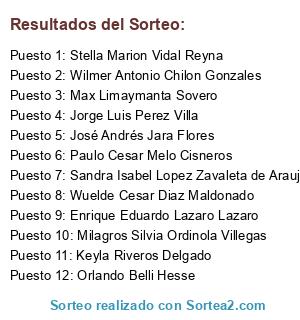 Lista de participantes: Juan Manuel García Calderón, Vanessa Marusia Del Carpio Beltran, Juan Yucra Apaza, Ruben Coaguila Coaguila, James Alberto Zuniga Alvarez, Maria Angela Escalante Arenas, Erick Moscoso Arce, Shirley Krystely Puma Bustinza, Victor Malaga Dezar, Maria Silvana Zevallos Barionuevo, Hugo Alberto Quea Mamani, Juan Javier Barriga Velarde, Carlos Chama Cardenas, Juan Atencio Vega, Patricia Yapura Romoacca, Azucena Amparo Calla Rodriguez, Jaime Roberto Lopez Gomez, Danitza Sofia Zeballos Cardenas, Gloria Raquel Rojas Orihuela, Juan Roberto Pachari Rosello, Renato Alonso Hurtado Medina, Miguel Torres Ponce, Jeison Manchego Palomino, Wilfredo Enrique Zavalaga Gonzalez, Gengger Jorge Boulangger Garay, Ruben Pampa Condori, Diego Franco Abuapara, Martín Víctor Salinas Chacón, Danilo Sevilla, Joseph Pizarro Marquez, Javier Pedro Ramos Quispe, Luis Angel Portocarrero, Alan Martín Chambi Quispe, Keyla Riveros Delgado, María Luisa Gonzales Mendoza, Marco Antonio Huamani Molloco, Mario Huanca Cabana, Anthony Enriquez Diaz, Mariela Aranzamendi Segovia, Maria Eugenia Paz Hidalgo, Diana Beatriz Dongo Quiroz, Maria Luz Melgar Torreblanca, Alejandro Lopez de Romana Olivares, Carlos Quiroz Paucar, Claudia Fuentes-Rivera Gutierrez, Roxana Prieto Guzmán, Sandra Espino Tipiani, Gerko Anthony Chavez Chavez, Oswaldo Moreno Arevalo, Jimena Chayna Batallanes, Cristel Cruz Quinones, Hernando Eliécer Prada Rojas, Danny Meza Manrique, Gerardo Alexander Tapia Mayhuire, Maria Teresa Mendoza Llerena, Julio Roberto Monjarás Salvo, Julio Ernesto Cafferatta Estefanero, Jose Rojas Gomez, Karina Salas Peralta, Gretty Karina Huamán Carreón, Miguel Angel Cazorla Díaz, Paul Christian Ramos Nuñez, Juan Roldan Cano, Fernando Lazo Chavez, J. Max H'ery Quispe Chambi, Danitza Ordiales Sosa, Wilfredo Murillo Vilchez, Ignacio Mamani Mamani, Darío Frías, Antonio Lazo de la Vega V., Midward Charaja Copaja, Jaime Javier Díaz Melgar, Victor Arenas Vasquez, Alfredo Saire Huaman, Adriana Sofía Arista Valdivia, Mauricio Surco Valenzuela, Guillermo Escobedo Aspajo, Andy Barreda Moscoso, Lucy Zavala Torres, Holguer Jürgen Rosa Guzman, Yuri Pawel Olivares Carbajal, Gandhi De La Flor Aimituma Nina, Wuelde Cesar Diaz Maldonado, Giovana Karen Poma Gutierrez, Jose Luis Soto Medina, Heyner Gomez Huamancaja, Roxana Perez Medina, Robhert Zenon Damian Condor, Adelina Quispe, Samuel Alejandro Vilchez Vargas, Jessica Nilda Gordillo Quispe, Pablo Christoper Sifuentes Almeyda, Angel Esteban Carlos Rossi, Carlos Alberto Ponce Peña, Jaime Lenar Gamboa Choque, Walter Martinez Lopez, Alejandro Daniel Villacorta Olaza, John Ruben Cordova Romero, Paola Montserrat Vecco Haddad, Miguel Angel Chavarria Egoavil, Sandra Elizabeth Huaman Orihuela, Jaime Infante Chuquimango, Maurino Espinoza Huerta, Kevin Calderón Quispe, Jose Fernandez Chavesta, Orlando Belli Hesse, Starlim Llanos Villagaray, Luisa Zuleyka Turkowsky Vizcarra, Anibal Fernando Nuñez Flores, Jose Lorenzo Idrogo Cieza, Pablo Ernesto Temoche Gil, Rafael Enciso Merino, Teodulo Severino Castillo Arce, Sergio Rojas Rimachi, Jorge Melchor Serna Fernandez, Carlos Javier Nina Ochoa, Omar Javier Campos Campos, Luis Enrique Albujar Cadenillas, Tomaz Centa, Keny Bastidas Orellana, Pedro Antonio Fuentes Poma, Elizabeth Marcilla Quispe, Milagros Silvia Ordinola Villegas, Marcelo Miranda Maldonado, Roberto Juan Zegarra Medina, Jeniffer Doris Garcia Chauca, Esthefany Soncco Mantari, Arnold Linares, Janet Valverde Cardenas, Cesar Augusto Zegarra Tello, Ricardo Pizarro Verastegui, Ana Pariguana Arias, Hector Carreño Castillo, Miguel Angel Collave Garcia, Ivan Zacarias Gonzales Saavedra, Luis Martin Chira Fernandez, Juan Jose Cubillas Perez, Miguel Salas Dávila, Polideportivo sede centro, Narciso Antero Arméstar Bruno, Angelo Daniel Ponce Huamaní, Mishelld Luz Chuquimajo Huaylinos, Max Limaymanta Sovero, Robert Daniel Ruiz Reyes, Angel Luis Quispe Dolores, Jody Helmut Palomino Rodriguez, Erick Saul Benites Cuenca, Erick Caycho Ponce, Rene Francisco Torres Garay, Jose Jonathan Vega Calla, Juan Jose Alarcon Andreu, Tito Raul Hernandez La Torre, Gino Luis Cuellar Navarrete, Carlos Cordova Torres, Francisco Abraham Maldonado Nevado, Jaime Eduardo Inga Arangurí, Fabiola Andrea Calderon Paredes, Carla Revelo Huamán, Stella Marion Vidal Reyna, Katherine Elizabeth Iparraguirre Rondon, Tami Eduardo Quincho Collachagua, Gemma Elizabeth Milagros Fonttis Arellano, Jasmin Cardenas Motta, Dante Muñoz Diaz, Justino Anglas Peña, Rafael Lorenzo Ordinola Pedemonte, Anamaria Del Pilar Solis Escajadillo, Max Franco Berrocal Quintana, Armando Sarco Montiel, Cesar Mar Guzman, Iván Díaz Ruiz, José Luis Vigo Terán, Anita Marcela Valderrama Mendiola, Miguel Angel Tudela Guillen, Gabriel Nicolas Baldeon Rodriguez, Paulo Cesar Melo Cisneros, Cesar Manuel Valdizan Velasquez, Marino Gomez Tito, Luis Angel Cruz Chalco, Jaime David Gil Lozano, Jhimy Brayan Aldana Ortega, Roxana Escobar Pacheco, Lizbeth Paola Delgado Gardez, Mirian Victoria Moncca Sapacayo, Marco Antonio Paz Reyes, Agustin Custodio Hilario, Ruben Gerardo Rodriguez Canepa, Francisco Manuel Rivas Chapoñan, Shirley Yenyter Vasquez Torres, Patricia Jesus Huyhua Chamana, Andrés Eduardo Rhor Lesevic, Augusta Maria Morales Corrales De Muñoz, Elizabeth Lourdes Del Aguila Valdez, Enit Vivanco Soto, Manuel Martin Alvarado Andrade, Ramon Hernan Robalino Gomez, Jorge Victor Castillo Migone, Carlos Hernan Cuba Anicama, Ana Cecilia Guerra Ravines, Milton Chuquiruna Bernales, Gisella Rocio Munayco Coronel, Claudia Cecilia Mendoza Pacheco, Kelly Victoria Yale Urcos, Giselle Paola Villa Marino, Miguel Angel Chávez Luna, Jaime Moshe Farfán Madariaga, Sara Doraluz Huaman Malache, Olga Elena Yengle De La Cruz, Carola Gabriela Rosas Lecaros, Huguez Enrique Ames Ramirez, Francisco Jose Camacho Jimenez, Fidel Matos Casas, Dennis Izquierdo León, Jaime Gomez Marin, Walter Francisco Calagua Cama, Ricardo Angel Zurita Armas, Hermenegildo Mendoza Cahuana, Da
